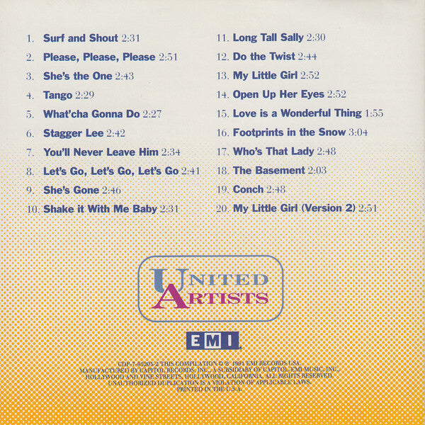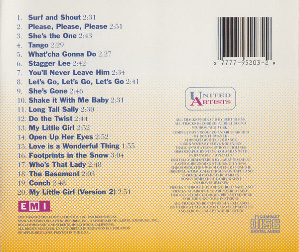 This compilation contains new stereo mixes mastered from the original 4-track master session tapes and 2-track master stereo mixes. The liner notes include a discography covering the years 1957-1968. Publishing, original release, and recording info: 1. Three Boys Music Corp.; United Artists 638 (1963-09), master ZTSP-87402; recorded 1963-08-15 2. Armo Music; United Artists 659 (1963-12), master ZTSP-87445; recorded 1963-08-15 3. Three Boys Music Corp.; United Artists 3313/6313 (1963-09-20), master U026547; recorded 1963-08-16* 4. Three Boys Music Corp.; United Artists 603 (1963-05), master ZTSP-85878; recorded 1963-08-15 5. Three Boys Music Corp.; United Artists 638 (1963-09), master ZTSP-87403; recorded 1963-08-15 6. Sheldon Music; United Artists 3313/6313 (1963-09-20), master U026541; recorded 1963-08-15 7. Robert Mellin Music; United Artists 659 (1964-12), master ZTSP-87444; recorded 1963-08-15 8. Lois Music Co.; United Artists 3313/6313 (1963-09-20), master U026544; recorded 1963-08-15 9. Three Boys Music Corp.; United Artists 605 (1963-05), master ZTSP-85879; recorded 1963-08-15 10. Three Boys Music Corp.; United Artists 3313/6313 (1963-09-20), master U026545; recorded 1963-08-15 11. Venice Music Inc.; United Artists 3313/6313 (1963-09-20), master U026549; recorded 1963-08-15 12. Frost Music And Jon-Ware Music; United Artists 3313/6313 (1963-09-20); recorded 1963-08-15 13. Three Boys Music Corp.; United Artists 714 (1964-04), master ZTSP-91120; recorded 1964-01-14 14. Three Boys Music Corp.; Veep 1230 (1966-06), master ZTSP-104927; recorded 1964-01-14 15. Three Boys Music Corp.; Veep 1230 (1966-06), master ZTSP-104926; recorded 1964-01-14 16. Three Boys Music Corp.; previously unreleased; recorded 1964-01-14 17. Three Boys Music Corp.; United Artists 714 (1964-04), master ZTSP-91119; recorded 1964-01-14 18. Three Boy Music Corp.; previously unreleased; recorded 1964-01-14 19. Three Boys Music Corp.; previously unreleased; recorded 1964-01-14 20. Three Boys Music Corp.; previously unreleased, master ZTSP-91120A; recorded 1964-01-14 * This is the only song with that date. Perhaps it is a typo. It seems likely they meant "Three Boys …".