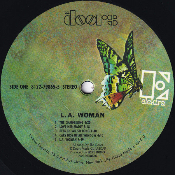 Recorded at The Doors Workshop in Los Angeles... Sticker: "Featuring the Original Stereo Mixes Includes L.A. WOMAN LOVE HER MADLY RIDERS ON THE STORM 8122-79865-5 180-GRAM VINYL RHINO VINYL 0 8122 79865 5 1" On rear sleeve: Manufactured in the E.U. On labels: Made in the E.U. From Rhino Records website: "The 12" reissue on 180-gram HQ virgin vinyl presents the original stereo mixes, artwork and inner sleeves. The lacquers were cut at Bernie Grundman Mastering in Hollywood, CA under the direct supervision of original Doors producer/engineer Bruce Botnick and Electra Records founder Jac Holzman." 2-color burgundy & black varnish-print sleeve, with radius corners and embossed "Doors" text . The front has a cut-out window with clear acetate, on which the band photo is printed black half-tone. The disc is contained in a yellow radius corner liner, which provides a yellow background to the cover image when inserted into the sleeve. The back of the liner has a black-print 'crucifix' image.