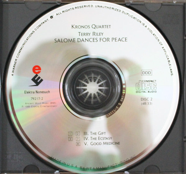 "Salome Dances For Peace" was written 1985-86 for the Kronos Quartet and dedicated to Ann Riley Part I was commissioned by IRCAM and parts II-V were commissioned by Betty Freeman Recorded August 1988 at "Skywalker Ranch", Nicasio, California Cover Photography "Wet Veil II" (1937) (P) 1989 Elektra Entertainment for the U.S. & WEA International for the world outside of the U.S.