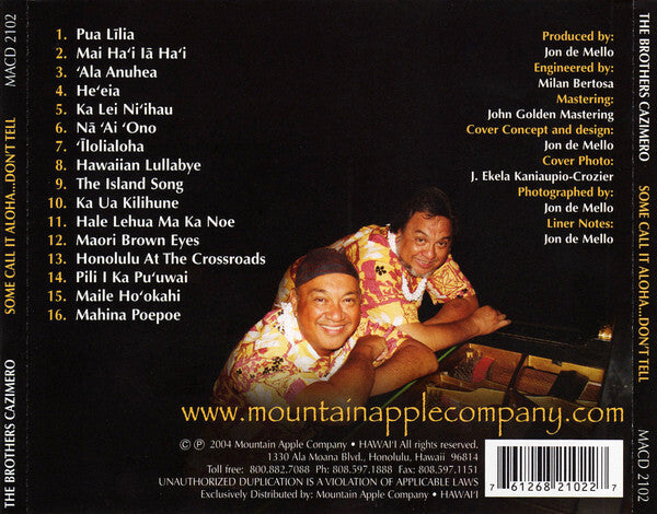 Dive into the rich tapestry of Hawaiian and Latin folk with The Brothers Cazimero's album "Some Call It Aloha...Don't Tell." This CD, produced by Jon De Mello in 2004, brings to life a blend of traditional and contemporary sounds that resonate with the spirit of the Pacific Islands. Enjoy a full hour of music that sweeps you away to the peaceful landscapes and vibrant cultures of Hawaii.