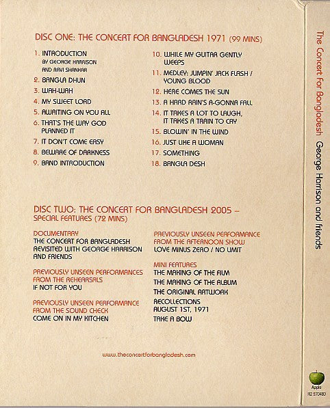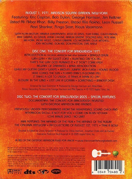 Experience the iconic "The Concert for Bangladesh" in this comprehensive 2-disc DVD set featuring a star-studded lineup including George Harrison, Bob Dylan, and more. This world music and pop music event, released in 2005 by Apple Records, captures an unforgettable night of music and charity. The DVD set is in NTSC video format and includes English language tracks, making it a must-have for any music lover or fan of the legendary George Harrison franchise.