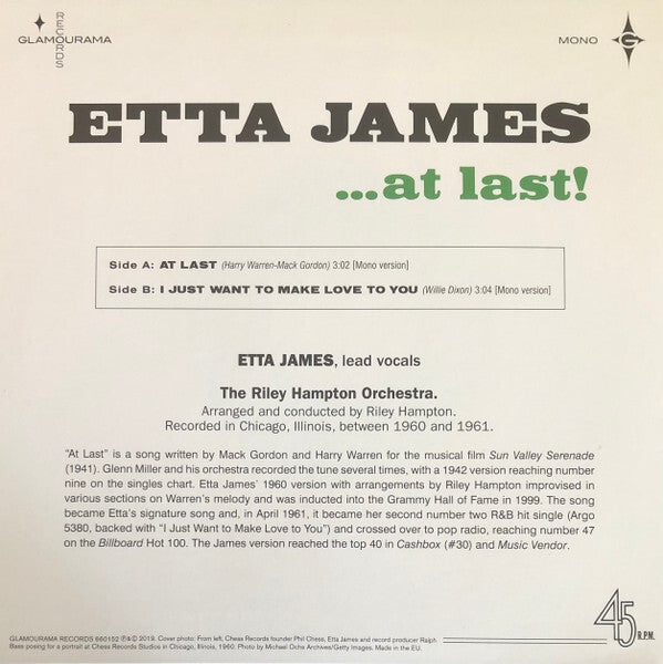 Experience the soulful melodies of Etta James with the brand new, mint condition vinyl record "At Last!" accompanied by a bonus 7" single on vibrant orange vinyl. Released in 2019 by Glamourama Records, this reissue captures the essence of classic R&B and the indelible spirit of the 1960s.