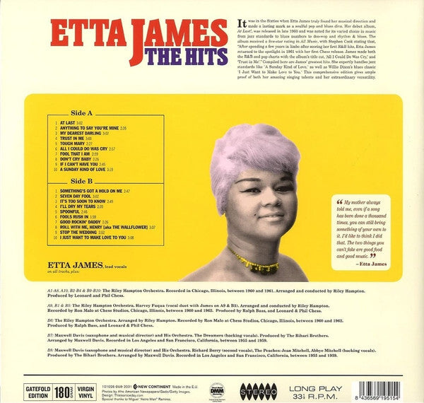 Experience the timeless classics of Etta James with "The Hits" limited edition vinyl, a must-have for any music aficionado. This 12" LP, pressed on high-quality 180-220 gram black vinyl, delivers rich, deep sound, capturing the essence of the legendary artist's vocal prowess. The compilation features a broad spectrum of genres including Blues, Gospel, Jazz, Pop, R&B & Soul, and Rock 'n' Roll, showcasing Etta James's influence and versatility in the 1960s musical era.