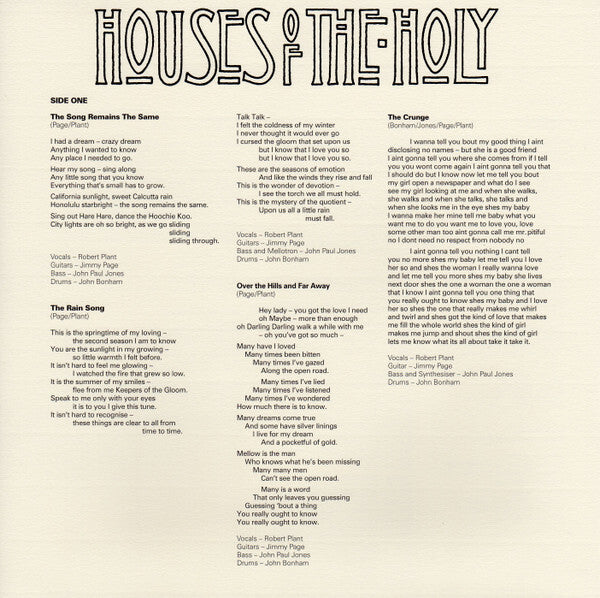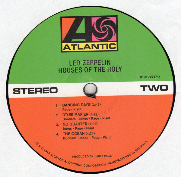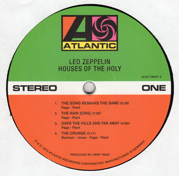 180 gram vinyl housed in a gatefold jacket and issued in a white poly lined inner sleeve. The gatefold jacket is sealed with a white bellyband including the following printed text: Front : Led Zeppelin Houses Of The Holy Back : [Atlantic logo] 8122796573 Includes an 11" x 11" thick velum style paper insert with lyrics and band line-up. Due to the nature of the hand etching, it can sometimes appear that there is a space between the letters and numbers of the Optimal Media GmbH identifiers. However, as per the Optimal Media GmbH label page, their runout scheme "is in fact always without spaces." [Sticker:] The classic album on 180g vinyl Remastered & produced by Jimmy Page Exclusive Collectible Backstage Pass Replica Only at Walmart [Insert:] Recorded at Rolling Stones Mobile Studio at Stargroves (Hampshire), Island Studio (London), Olympic Studios (London) ℗ & © 1973 Atlantic Recording Corporation, a Warner Music Group Company. [...] All lyrics administered by WB Music Corp. (ASCAP) Made in the EU. 8122796573 [Labels:] ℗ & © 1973 Atlantic Recording Corporation. Manufactured in Germany.