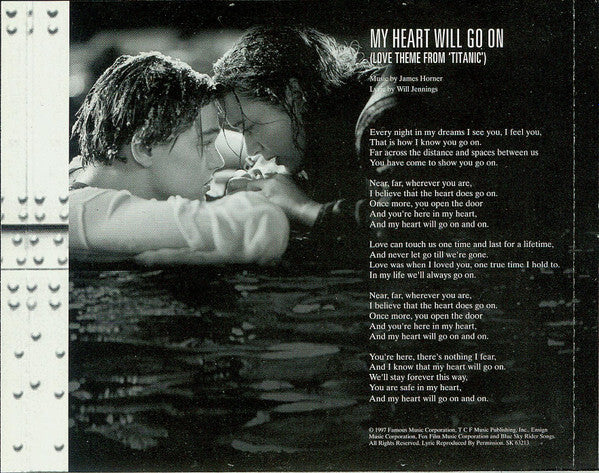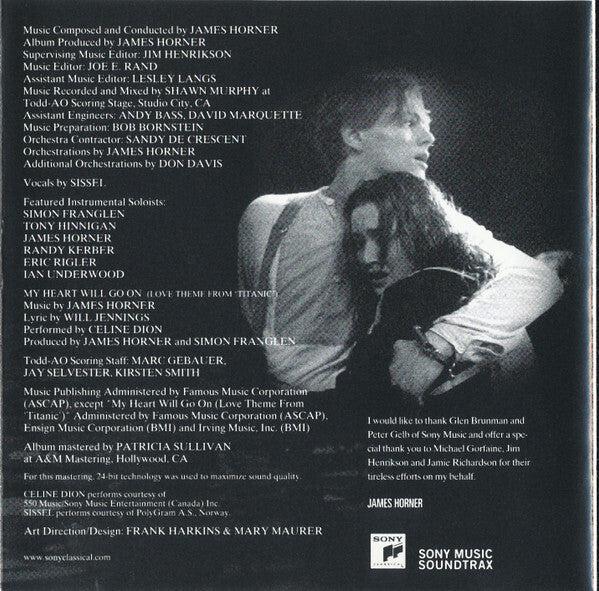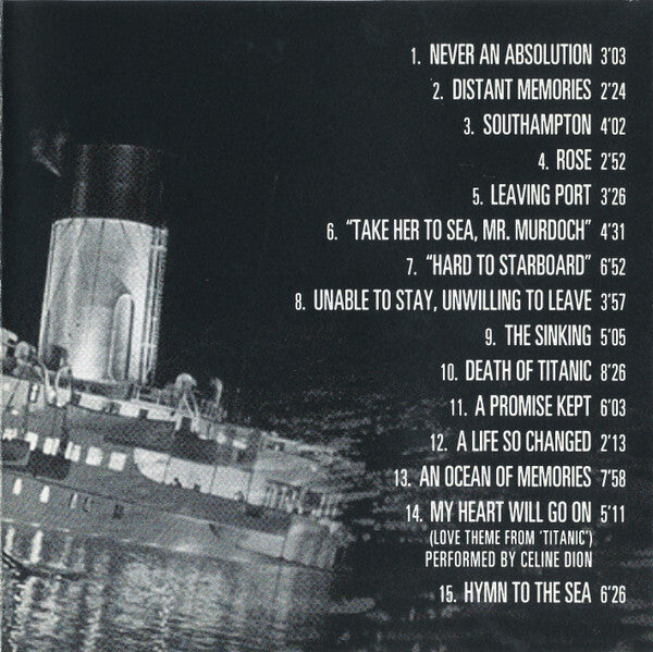 James Horner's Titanic: Music From The Motion Picture CD is a sweeping, emotional soundtrack that became as iconic as the film itself. Released in 1997 by Sony Classical, it features Horner's lush orchestral compositions that blend Celtic influences with cinematic grandeur—perfectly capturing the romance and tragedy of the Titanic's story. The album includes unforgettable tracks like "Southampton," "Rose," and "The Sinking," culminating in the global hit "My Heart Will Go On" performed by Celine Dion. The CD includes 15 tracks, with standout moments like "Hymn to the Sea" and "An Ocean of Memories" that still resonate with listeners today.