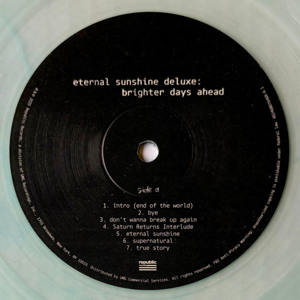 Experience Eternal Sunshine (Deluxe: Brighter Days Ahead), the expanded edition of Ariana Grande’s critically acclaimed album, featuring nine bonus tracks, including six brand-new songs. This 2-LP set is pressed on stunning translucent marble vinyl and housed in a gatefold jacket, making it a must-have for collectors and fans alike.