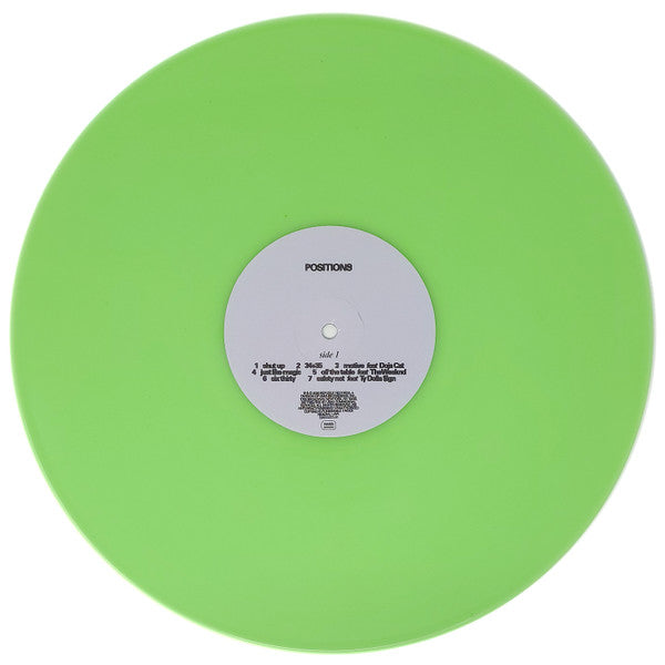 Positions is the sixth studio album by Ariana Grande, released in 2020 on Republic Records. It features the #1 title track, which topped the charts in multiple countries, and the hit singles, "34+35" and "POV." Available on glow-in-the-dark vinyl with two collectible poster inserts included. Limited Edition.