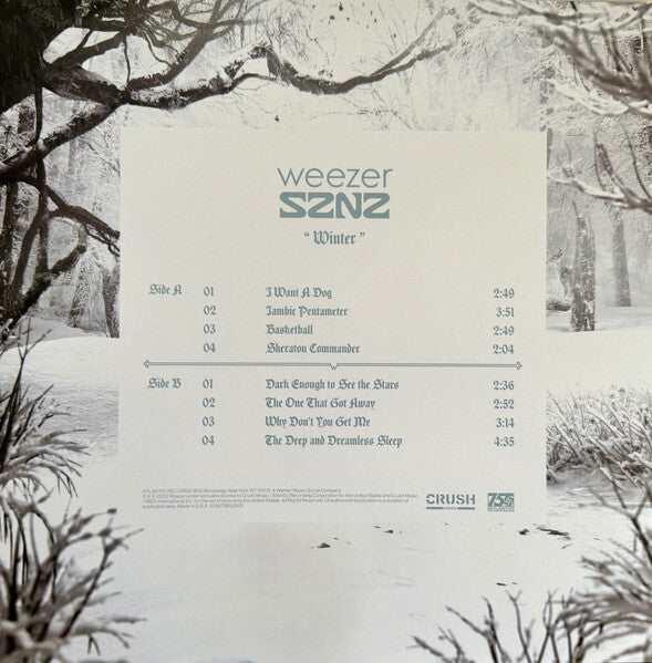 Embrace the chill with Weezer - SZNZ: Winter, the final installment in their seasonal series. Overflowing with introspection and emotion, this album showcases Weezer's signature sound with a frosty twist. Featuring beautifully crafted tracks that reflect the quiet beauty and melancholy of winter, it's a must-have for fans and collectors alike. Let SZNZ: Winter warm your soul with its heartfelt melodies and captivating lyrics—experience the season through Weezer's artistry!