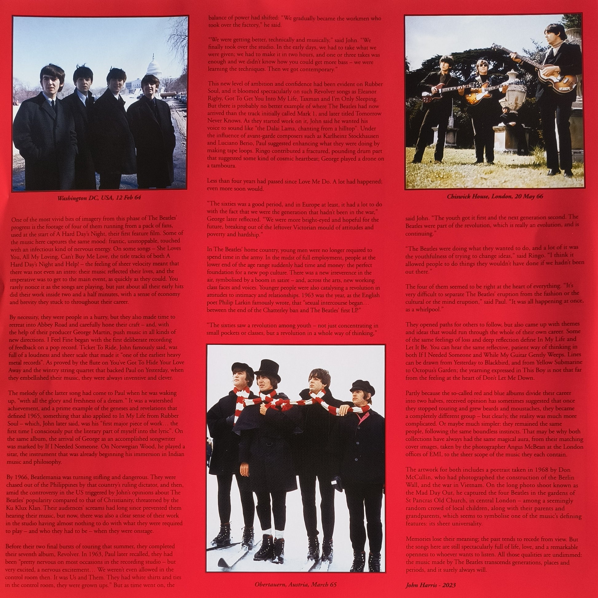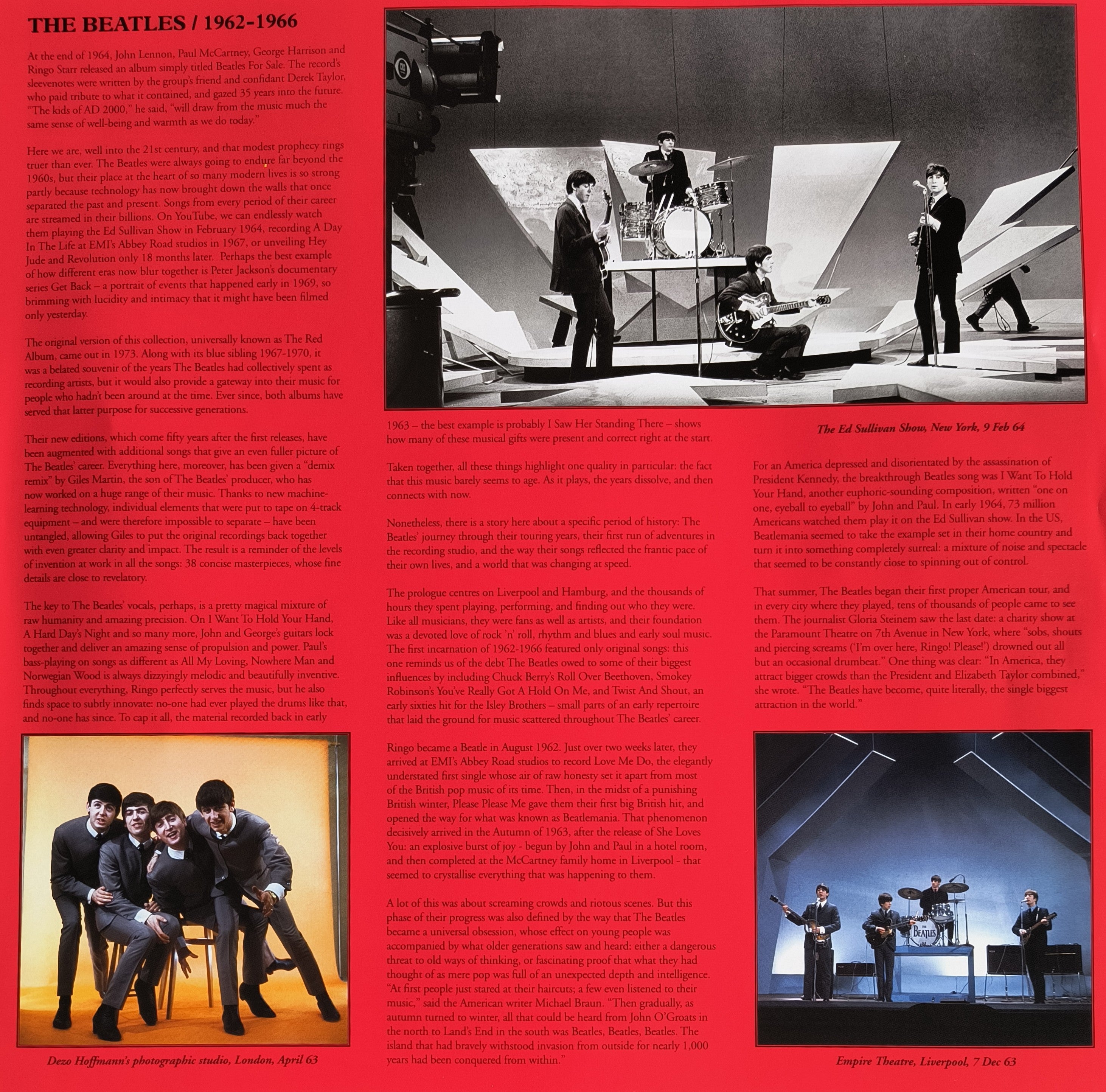 Remixed and Expanded: ‘Red' has 12 additional tracks, including for the first time some of George Harrison's earliest songs and some classic Beatles versions of R&B and rock ‘n' roll hits that were so influential on the band. The 3LP collection now contains 38 tracks. The set's 12 newly added tracks are collected on its 3rd LP. With an insert containing new sleeve notes by journalist and author John Harris, the new 1962 - 1966 collection is a joyous celebration of The Beatles' timeless musical legacy. Half speed master 180g pressing Sticker on back of shrink: "Made in Germany"