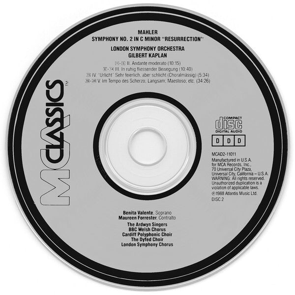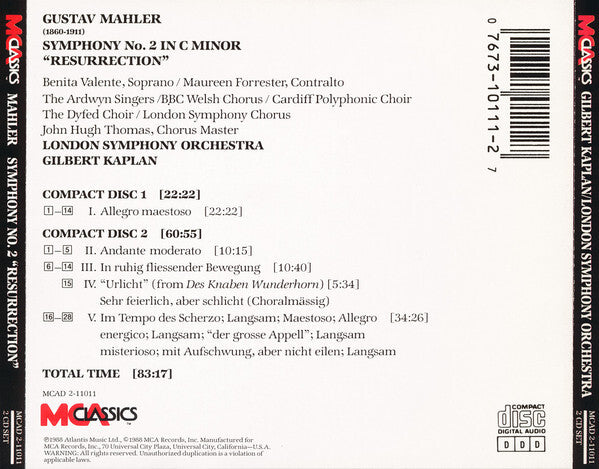 Includes: - 64 page booklet with Cues and timings, comprehensive notes about the symphony, performing artist information, and photos. - A separate "Letters" booklet, "containing 92 highly personal and revealing excerpts from Mahler's letters" (regarding his second symphony). The booklet was compiled and edited by Gilbert Kaplan. Location_ Recording: Yale Memorial Carillon, Harkness Tower and Newberry Memorial Organ, Woolsey Hall, Yale University, New Haven, Connecticut, USA ℗1988 Atlantis Music Ltd., ©1988 MCA Records, Inc.