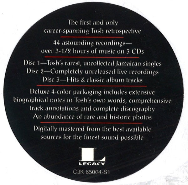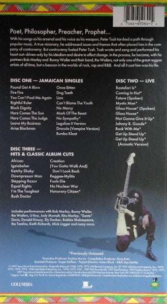 Peter Tosh - Honorary Citizen is a remastered 3CD box set released in 1997 by Legacy Recordings/Columbia (catalog number C3K 65064), compiling rare Jamaican singles, live performances, and classic album cuts. Housed in a sturdy slipcase, it includes a 60-page hardcover booklet featuring rare photographs, in-depth liner notes by Peter's sister Sharon Lewis, track commentaries by reggae historian David Katz, and archival essays on Tosh's legacy and activism.