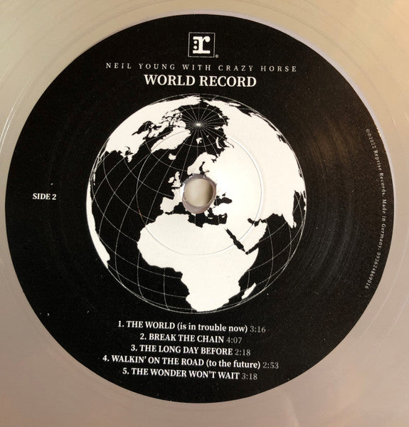 The album features 10 new Neil Young compositions (plus a short reprise of one song) and was mixed to analog tape at Rubin’s Shangri-la studios using a selection of vintage instruments and equipment. To optimize the audio quality, the vinyl format will be released as a 3-sided double album with an etching on side 4. 'World Record' will also be released on CD (2 CDs mirroring the track sequence of the double LP) and cassette. World Record contains ten songs, nine written during the last year about the events and condition of our world.
