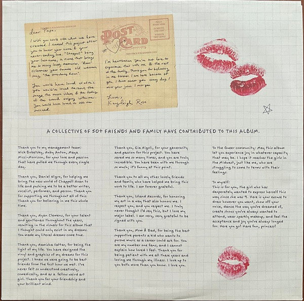 1 year anniversary edition pressed on "My Kink is Coral" Peach colored vinyl Issued in an embossed die-cut o-card jacket slip cover, gatefold jacket filled with silver star confetti, and printed inner-sleeves with lyrics & credits. 1st catalog number on gatefold 2nd catalog number on hype sticker The title of the release differs between sources: - "The Rise & Fall Of A Midwest Princess" printed on die-cut o-card slipcover - "The Rise And Fall Of A Midwest Princess" on hype sticker Track B2 is stylized in uppercase. Side D is blank. Amusement Records, KRA International Inc, under exclusive license to Island Records, a division of UMG Recordings, Inc.