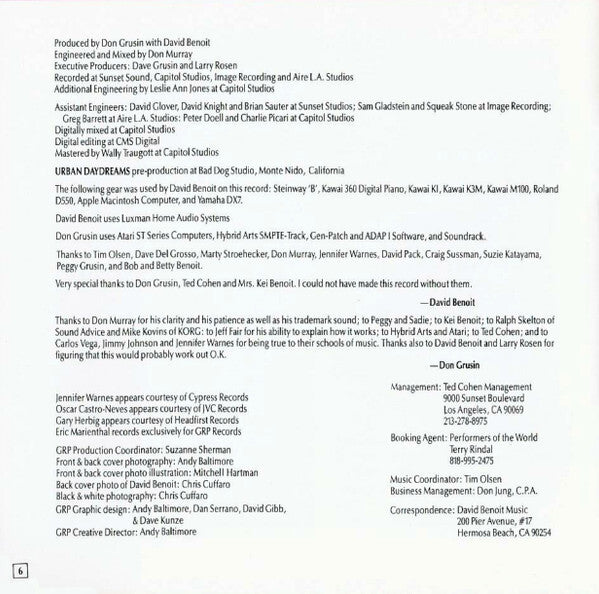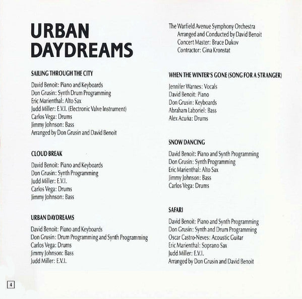 Immerse yourself in the sophisticated sounds of David Benoit - Urban Daydreams , a smooth jazz masterpiece blending elegant piano melodies with rich, atmospheric arrangements. This essential CD delivers Benoit's signature artistry, evoking cityscapes and quiet reflection through expressive compositions. Perfect for jazz enthusiasts and collectors, Urban Daydreams is a must-have for fans of refined instrumental storytelling. Add it to your collection today!
